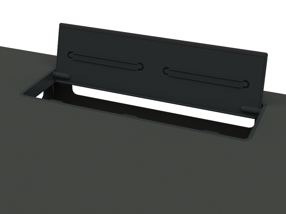 The cable tray is discreetly nested underneath the work top.The friction hinge is grooved and can also be used as a stand for mobile phones and tablets.